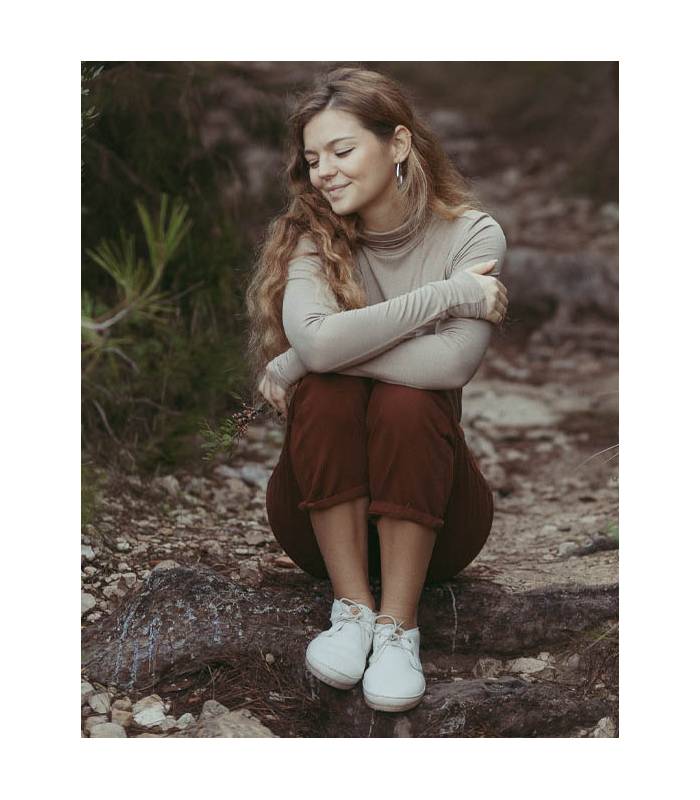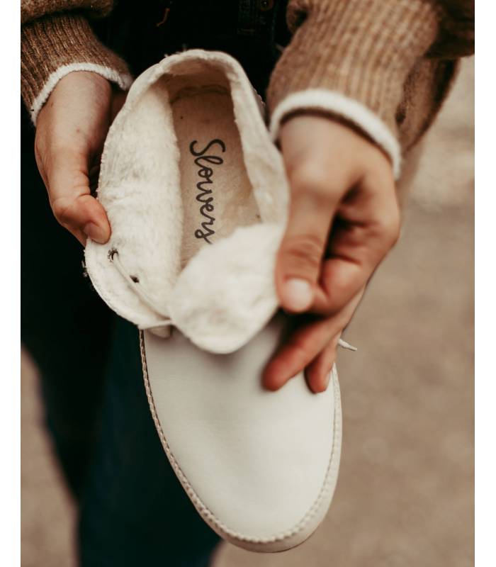 Die Innenseite ist mit Bio-Baumwolle mit Lammfellstruktur gefüttert, angenehm und warm für den Winter. Die Naturkautschuksohle ist sehr flexibel. In langsamem Tempo in Spanien hergestellt.