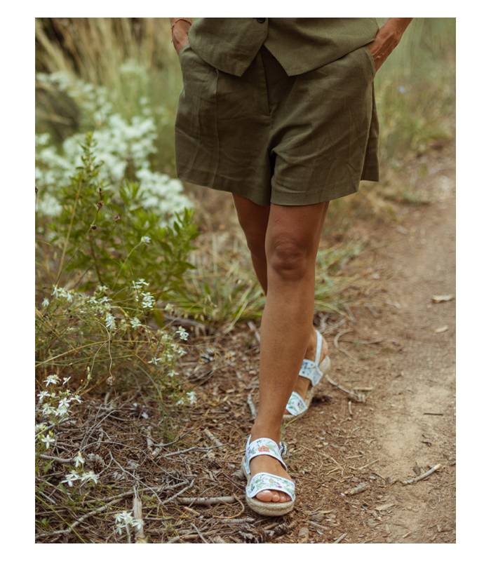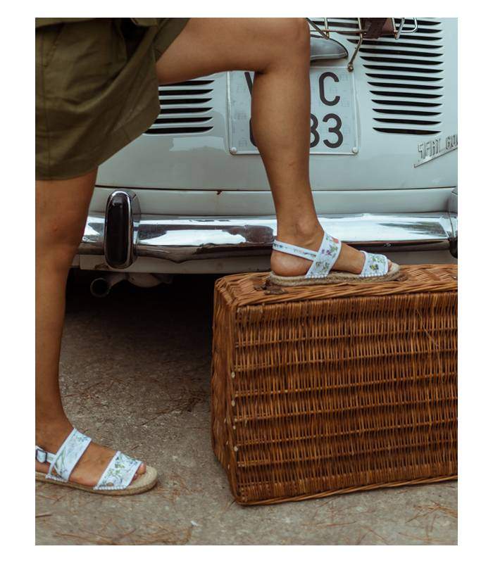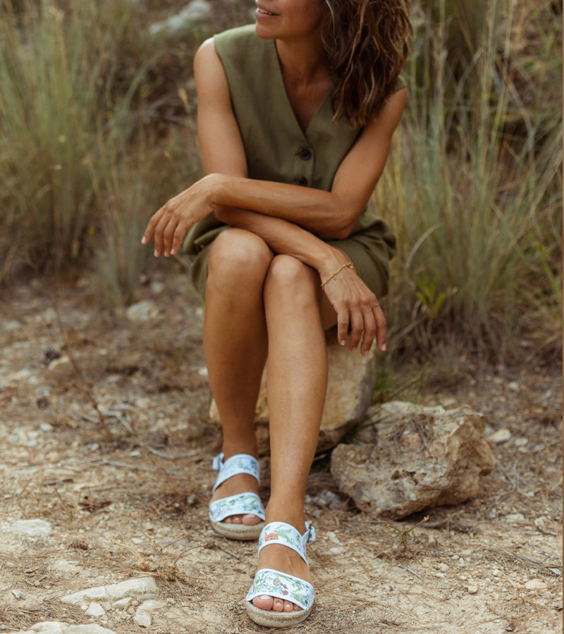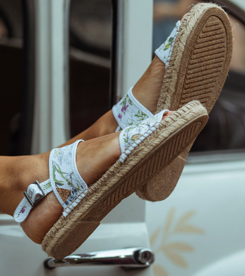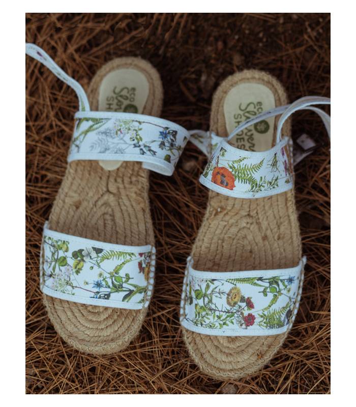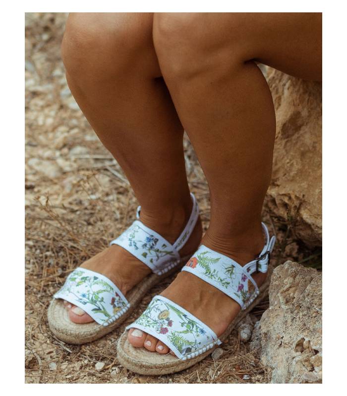 Vegan flat sandals with buckle . Organic cotton fabric printed with the Casita de Wendy herbal illustration. Handmade in Spain at a slow pace. Organic and vegan .