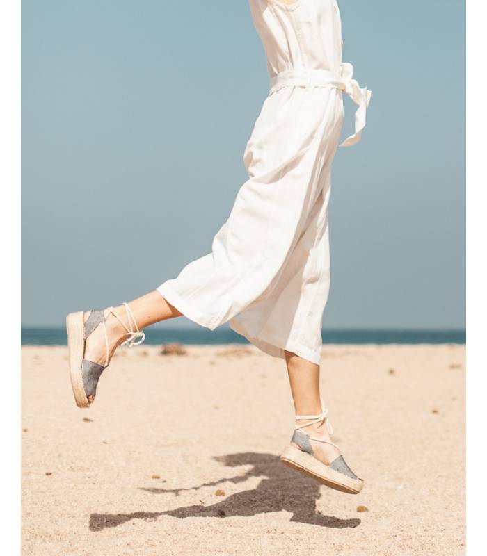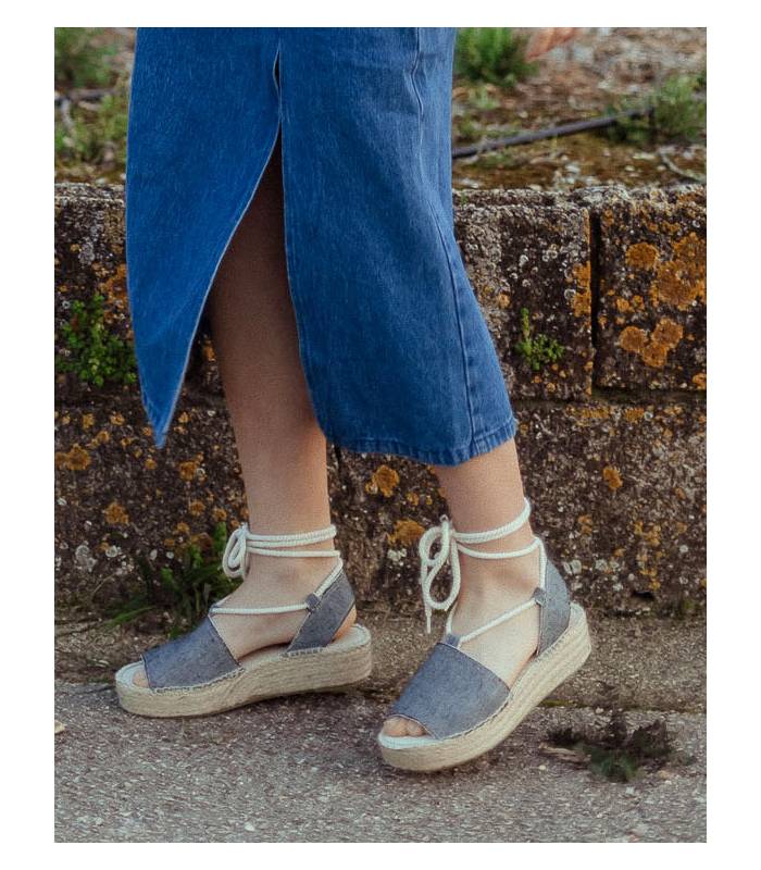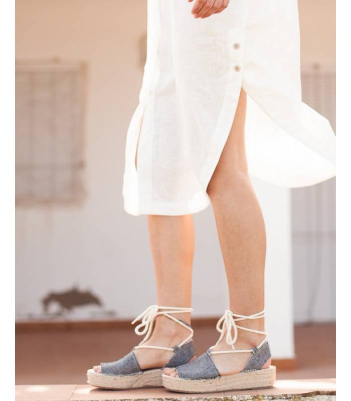 Sandalias de yute con plataforma y cordones. Tejido de algodón-poliéster reciclados. Cordones de algodón. Orgánicas y veganas. Hechas a mano en España a ritmo slow.
